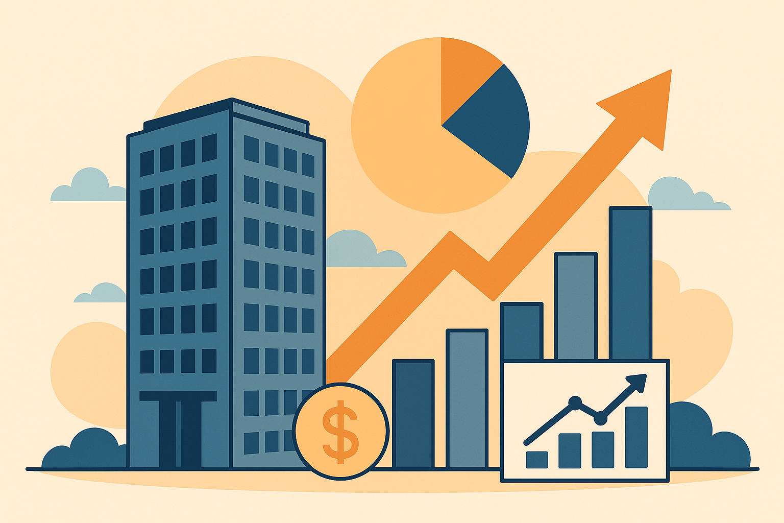 Vector illustration of a commercial building with rising charts and graphs, symbolizing growth in real estate investing.